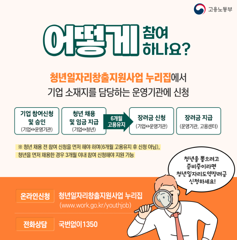 먼저 기업에서 참여 신청하여 채용계획을 제출한 후, 운영기관이 해당 자료를 검토 후 승인되면 청년을 채용하고 운영기관에 채용자 명단을 제출하게 됩니다. 이후 6개월간 고용을 유지하면 운영기관에 장려금을 신청할 수 있습니다.